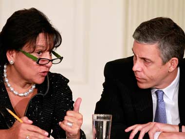 Washington: Education Secretary Arne Duncan and Federal Communications Commission chairman Julius Genachowski on Wednesday challenged schools and companies to get digital textbooks in students’ hands within five years. The Obama administration’s push comes two weeks after Apple Inc. announced it would start to sell electronic versions of a few standard high-school books for use on its iPad tablet. Digital books are viewed as a way to provide interactive learning, potentially save money and get updated material faster to students. Digital learning environments have been embraced in five states. But many schools lack the broadband capacity or the computers or tablets to adopt the technology, and finding the money to go completely digital is difficult for many schools in tough economic times. [caption id=“attachment_200721” align=“alignleft” width=“380” caption=“Penny Pritzker, chairman and founder of Pritzker Realty Group, left, talks with Education Secretary Arne Duncan. AP”]  [/caption] Tied to Wednesday’s announcement at a digital town hall was the government’s release of a 67-page “playbook” to schools that promotes the use of digital textbooks and offers guidance. The administration hopes that dollars spent on traditional textbooks can instead go toward making digital learning more feasible. Going digital improves the learning process, and it is being rolled out at a faster pace in other countries such as South Korea, Genachowski said in an interview. Genachowski said he is hopeful it can be cost effective in the long run, especially as the price of digital tablets drops. “When a student reads a textbook and gets to something they don’t know, they are stuck,” Genachowski said. “Working with the same material on a digital textbook, when they get to something they don’t know, the device can let them explore, it can show them what a word means, how to solve a math problem that they couldn’t figure out how to solve.” Students can use the textbooks for video explanations to help with homework, they can interact with molecules, and they can manipulate a digital globe to see stories and data about countries, said Karen Cator, director of the Education Department’s office of education technology. “We’re not talking about the print based textbook now being digital. We’re talking about a much more robust and interactive and engaging environment to support learning,” Cator said. About $8 billion is spent annually in the U.S. on textbooks for children in kindergarten through 12th grade, said Jay Diskey, the executive director of the school division of the Association of American Publishers. Diskey said textbook companies have been working on the technology for the past five years to eight years to transform the industry, but that in many cases, schools simply aren’t ready. “It’s not only the future, it’s the now. The industry has embraced this, but the difficulty does lie in the fact that schools are not yet fully equipped with the hardware. We hope that they get there soon,” Diskey said. AP
