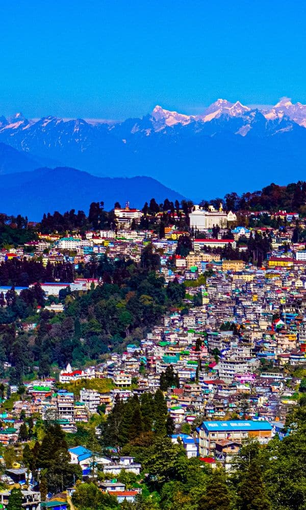 The Japanese Peace Pagoda, perched on a hill, provides panoramic views of Darjeeling town and the Himalayan mountains.