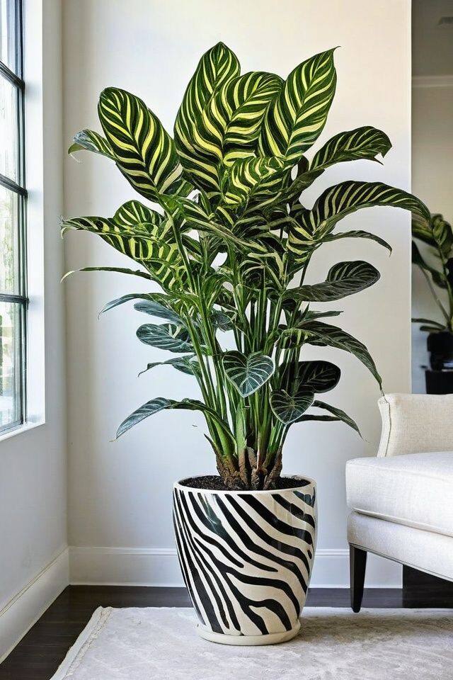 Calathea ‘Triostar’ (Stromanthe sanguinea)This plant flaunts striking pink, green and white foliage. It’s perfect for tabletops or corners needing a colour pop.