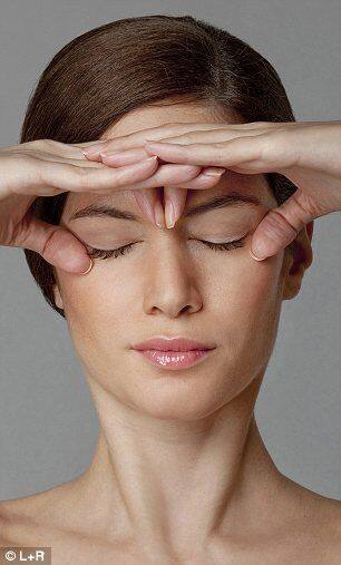 Eyebrow resistance liftPlace fingers above brows and push down gently while trying to lift eyebrows. Repeat. This strengthens the forehead and eye area, helping reduce droopiness and puffiness.