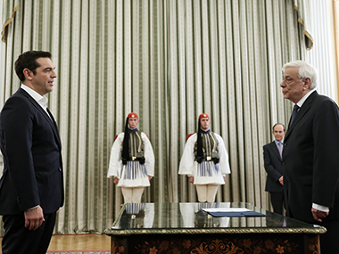 Athens: Greek Prime Minister Alexis Tsipras on Monday took his oath of office a day after being re-elected in a snap general election. [caption id=“attachment_2441464” align=“alignleft” width=“380”]  Image courtesy: AP[/caption] Tsipras took a civil oath “to uphold the constitution and laws” of the country, and is expected to name a coalition government by Wednesday to begin applying the terms of the tough EU bailout he signed onto in July. After being brought down by an anti-austerity revolt in his Syriza party, Tsipras on Sunday comfortably won re-election by a margin of over seven percent over the runner-up, the conservative New Democracy party. He will again partner up in government with the nationalist Independent Greeks party, his coalition allies in the previous government, but the two parties this time round will have a reduced parliamentary majority of 155 MPs in the 300-seat chamber to apply the reforms of the new bailout. AFP