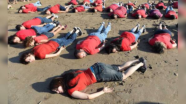 Moroccans are seen adopting a position similar to the lifeless body of Syrian three-year-old Aylan Kurdi, who drowned while attempting to reach the Greek island of Kos. Image courtesy: AFP