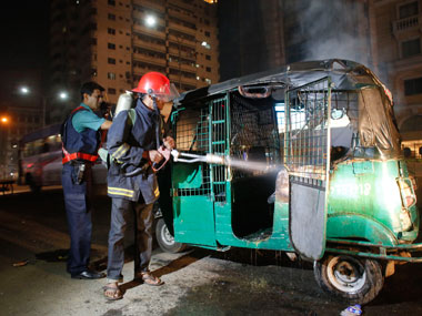 A firefighter and a policeman extinguish a fire on an auto rickshaw in Dhaka November 25, 2013. Supporters of Bangladesh Nationalist Party (BNP) led opposition parties blast crude bombs. Reuters[/caption] An unidentified man was killed in clashes between opposition activists and the police in north-western Sirajganj. Acts of sabotages were reported from different other districts. The other two deaths were reported on Monday night soon after the announcement of the election schedule. Police said a youth died instantly after a crude bomb hit him on the head in central Comilla and a rickshaw-puller was killed in the capital in a separate incident. Railway links between Dhaka and south-eastern port city of Chittagong and north-eastern Sylhet were cut off as the opposition activists uprooted of train tracks at central Brahmanbaria while they set on fire several compartments of a stationed train at north-western Iswardy. Buses were stopped as the opposition coalition on Monday night announced the blockade for highways, railways and waterways to protest against the “election of farce”, prompting authorities to call out paramilitary BGB troops to guard the capital and other major cities. Chief Election Commissioner Kazi Rakibuddin on Monday announced the election schedule, pitting ruling Awami League against the BNP, which has been demanding that the polls plan be shelved until the settlement of the dispute over the modality of the interim government. Rakibuddin said the statutory independent constitutional body so far awaited the major parties to reach an understanding over their dispute “but now we don’t have time to delay further” as the commission was obligated to hold the polls within January 24 under a constitutional deadline. According to the schedule December 2 is the last date for submission of nomination papers, meaning the opposition must decide its stance on the polls in the next one week.