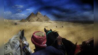 This photo shows a man leading tourists riding horses at the historical site of the Giza Pyramids near Cairo through the lowered veil of a niqab, which is worn by some conservative Muslim women. The cloth allows women to follow a strict interpretation of their religious beliefs by preventing others from seeing their faces. (AP Photo/Hassan Ammar)