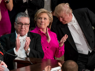 New York: Hillary Clinton and Donald Trump exchanged jokes sprinkled with acid remarks at a New York charity dinner held one day after the last presidential debate before the US elections on 8 November. The two candidates managed to sit two seats from each from each other and remain - mostly - civil on Thursday night at the white-tie Al Smith Dinner, the traditional break from attacks during every US presidential campaign cycle, NBC News reported. Trump and Clinton did not appear to acknowledge each other as they arrived to take their seats flanking Cardinal Timothy Dolan, the archbishop of New York, at the upscale Waldorf-Astoria hotel. But the two nominees both smiled broadly and laughed at each other’s needles, and they did shake hands after the event. [caption id=“attachment_3063962” align=“alignleft” width=“380”] From left, Alfred E. Smith IV, Democratic presidential candidate Hillary Clinton, and Republican presidential candidate Donald Trump. AP[/caption] The Manhattan billionaire started by noting that he knew he was supposed to begin with a “self-deprecating joke”. “Some people think that might be tough for me,” he said to laughter. “The truth is I’m actually a modest person. In fact, people tell me modesty might be my best quality - even better than my temperament.” Trump then riffed on themes he brings up often on the campaign trail, such as mocking the size of Clinton’s rallies and media bias, NBC News noted. Eventually, boos began emerging as Trump dropped the jokes almost entirely. “Here she is in public, pretending not to hate Catholics,” Trump said, referencing an apparent email exposed by WikiLeaks in which a Clinton spokeswoman seemed to joke about Catholics and evangelicals. Trump also brought up a moment from Wednesday night’s debate. “Last night, I called Hillary a ’nasty woman’. This stuff is all relative. After listening to Hillary rattle on and on, I don’t think so badly of Rosie O’Donnell (TV personality) anymore. In fact, I’m actually starting like Rosie a lot,” Trump said. Clinton stuck to the traditional script as she took the dais second. “I took a break from my rigorous nap schedule to be here,” she told the audience. “Usually, I charge a lot for speeches like this.” Turning to Trump, the former Secretary of State said, “Donald, if at any time you don’t like what I say, feel free to stand up and shout ‘Wrong!’ after I say it.” And diving into Trump’s remark that he would not accept the result of the upcoming election if he lost, she said: “I’m surprised I’m up here at all. I didn’t think he’d be OK with a peaceful transition of power.” The Alfred E. Smith Memorial Foundation Dinner — held the third Thursday of every October — is a tradition in American presidential politics and marks the last time the two nominees share a stage, CNN reported. Named for the former New York governor and first Catholic to receive a major party nomination when Democrats tapped him to oppose Herbert Hoover in 1928, the Manhattan event has an attendance of more than 1,500 donors who give more than $3,000 each to Catholic charities for tickets.