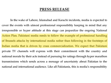 Pakistan’s electronic media regulatory body (PEMRA) on Sunday released a statement for the Pakistani media asking them to be “professional” and “responsible” when reporting on Lahore attacks. It was a very standard press release except for this line which caught the eyeballs. “Pakistan needs to follow the example of professional handling of Brussels attacks by international media rather than following the footsteps of Indian media that is driven by crass commercialisation.” A suicide bomber who attacked the Gulshan-e-Iqbal park thronging with families celebrating Easter on Sunday killed at least 72 people, with several children among the dead. More than 200 people were injured when explosives packed with ball bearings ripped through the crowds near a children’s play area in the park. As news of the inhumane terror attack was being reported by Pakistani media, the PEMRA issued a strong advisory to all Pakistani media channels to “cover the events with utmost professional responsibility, keeping in mind that any irresponsible or hyper attitude at this stage could jeopardize the ongoing National Action Plan”. It is, however, interesting that the international media (who the PEMRA hails in their statement) came under heavy criticism on social media for not giving enough coverage to Lahore attacks compared to their reportage and analysis of the Brussels attack.