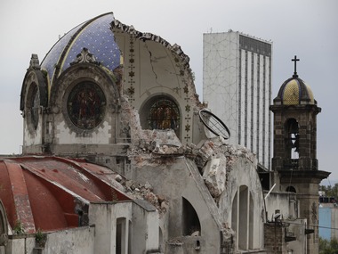 A church damaged after the Mexico earthquake. AP[/caption] “Just hearing the earthquake alarm was horrible,” Hernandez said of a siren that rang during a 6.1 quake Saturday that was an aftershock of an even earlier and bigger temblor on 7 September . “Something moves and …” he said, his voice trailing away at the unspeakable thought the whole pile could suddenly collapse. “There is a lot of nervousness, a lot of desperation. … This is the worst thing I have ever seen in my life, the worst.” A total of 38 buildings in the Mexican capital— mostly apartment blocks or office buildings—collapsed in the 19 September earthquake, and the first days saw a dramatic scramble with picks, shovels and bare hands to reach survivors. Mexican marines, the lead force in many of the rescue efforts, said they had recovered 102 bodies and rescued 115 people alive from buildings toppled by the quake, which has killed 320 people including 182 in the capital alone, according to the latest death toll announced Sunday. Thousands more have been left homeless because their houses or apartment buildings, while still standing, have been rendered too dangerous to remain. Mexico City Mayor Miguel Angel Mancera reported that 7,649 properties have been examined and 87 percent of those are safe and require only minor repairs. But that means about 1,000 left standing have been deemed uninhabitable—and the number seemed likely to rise as more are inspected. Mancera also said Saturday night on Twitter that nearly 17,000 people have been “attended to” at 48 shelters, though it’s not clear how many of those are being housed there. Many are bunking with family or friends. Inspections of the city’s nearly 9,000 public and private schools have only barely begun. Federal Education Secretary Aurelio Nuno said Sunday that only 103 schools had been approved to resume classes Monday. One by one the searches have closed down in recent days, after sniffer dogs were sent in and didn’t find life and thermal imaging devices turned up no body heat signatures. Then, heavy machinery moved in to begin removing the mountains of debris. Empty lots began to appear where just days ago a building stood. Now hopes were focused solely on concrete slabs at two sites: the former office block in the Roma Norte neighborhood, where around 40 people were believed to be missing, and an apartment building on the south side where searchers were looking for five people. At the latter site, members of a Japanese search and rescue team pulled a small white dog from the rubble alive Sunday afternoon, cradling and petting it as they brought it down. Expert search teams that flew in from other countries including the United States and Israel have worked alongside their Mexican counterparts this week to help tunnel, measure and direct the removal of chunks of concrete. At the Roma Norte site, after Saturday’s aftershock passed, work began again, grim, controlled, purposeful. An enormous crane lifted huge chunks of concrete slab. Previously rescuers carved reinforced vertical tunnels into the heart of the wreckage, and from there crawled into the narrow, claustrophobic horizontal spaces left between the collapsed floors. Work stopped again for about an hour Sunday afternoon after the mound of debris shifted, resuming after experts checked the pile for stability. The last time someone was found alive was Wednesday, when a woman was pulled from the rubble. A couple of bodies were found Friday. Volunteer rescue worker Johny Yebra said the smell of death was now heavy directly atop the rubble heap, and by Sunday afternoon, occasional gusts of wind were blowing it outside the immediate search site. “All of us are doing the most we can,” Yebra said. Beyond the barricades and the ring of floodlights that lit the area overnight lay a makeshift collection of tents and tarps where anxious family members have endured rain, cold, grief and sleeplessness. “It has been many days. Four, five … we can only wait and bear what happens,” said Enrique de Luna, the uncle of another missing man, Said Guzman. As the names of the confirmed dead trickled in, one by one, their relatives have been packing up their tents and going away. That happened Saturday with the family next to Moreno’s. They didn’t say a word as they left weeping, and nobody had the courage to ask them what news they had received. Everyone was even more on edge Sunday as rescuers told families they were going to lift a large slab that could reveal some information about anyone inside. “We are very nervous. They’re going to remove the last rock in there,” said Dario Hernandez, Adrian Moreno’s friend. Some fell silent and didn’t want to talk anymore. Next to a tent someone had strung up a canvas sign: “Adrian, you are a warrior. Your family, your friends and Dario are waiting for you.”