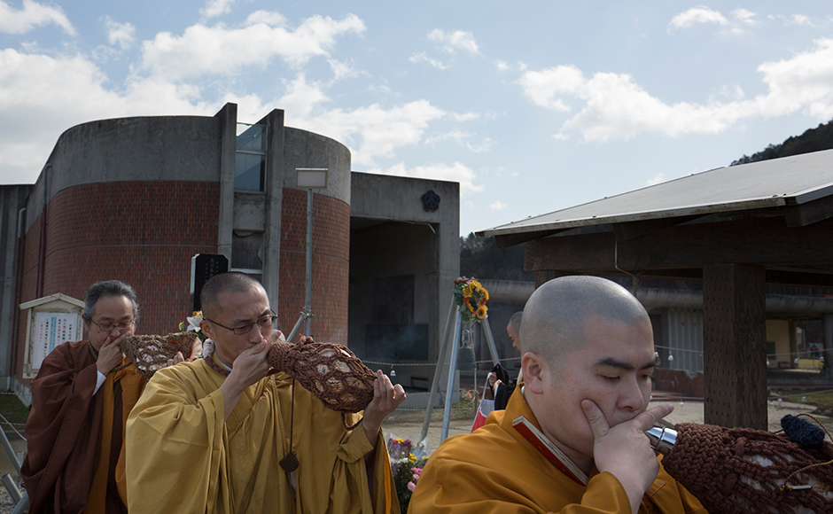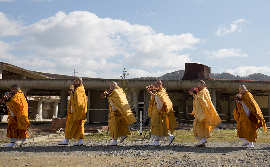 Buddhist monks offer prayers in front of the memorial at Okawa Elementary School in Ishinomaki, Japan on Friday. Overall 470,000 people were evacuated from the area around Fukushima as the scale of the radiation threat became clear. Getty Images