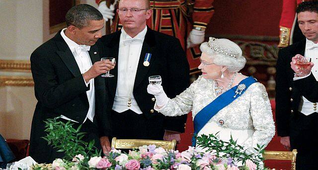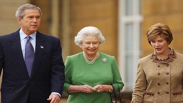File image of Queen Elizabeth II, and US President Barack Obama attending a state banquet in Buckingham Palace, London. AP[/caption] The Queen invited the Obamas for a state visit in 2011 that included a two-night stay at Buckingham Palace and a lavish banquet in the president’s honour. As Obama delivered a toast to the Queen, he didn’t miss a beat when the band assumed that a pause in his remarks meant he had concluded and launched into a rendition of “God Save the Queen.” Obama kept talking over the music until the band quieted down. The couples saw each other again in 2016 when Obama visited the Queen at Windsor Castle a day after her 90th birthday during another swing through Europe. George W Bush Bush detested stuffy, formal affairs, but he donned a white tie-and-tails tuxedo after the Queen pulled out all the stops for a state dinner in his honour at Buckingham Palace in November 2003. [caption id=“attachment_11219751” align=“alignnone” width=“640”]