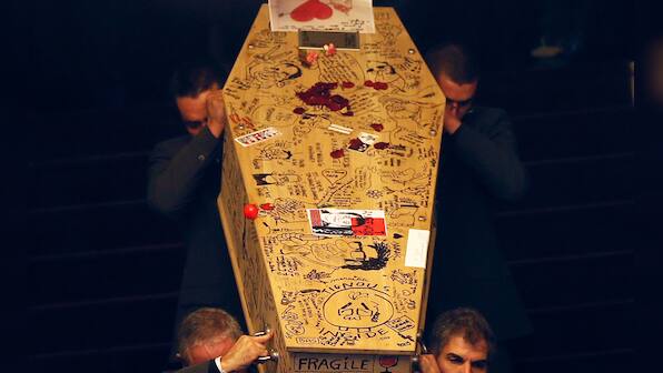 Pallbearers carry the coffin of late satirical French magazine Charlie Hebdo cartoonist Bernard Verlhac, known as Tignous, after a tribute at the Montreuil town hall, near Paris. Ceremonies continue to honour the memories of the 17 people who were killed in last week’s attacks. Reuters