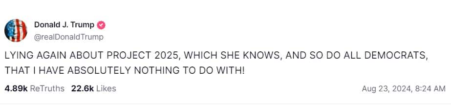 Just like before, Trump attempted to distance himself from Project 2025. While giving a “play-by-play” reaction to Harris’ address, Trump accused Harris of lying about the matter. “LYING AGAIN ABOUT PROJECT 2025, WHICH SHE KNOWS, AND SO DO ALL DEMOCRATS, THAT I HAVE ABSOLUTELY NOTHING TO DO WITH!” he wrote on his social media platform TruthSocial.