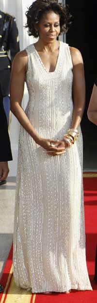 The Washington Post reported that Obama “shimmered in an all-over embellished gown… It was an ivory, V-neck column dress embellished with silver beads, white sequins and metallic thread in a geometric pattern - and she’s back to what seems like her favorite seasonal sleeveless look, which shows off her famously toned arms.”