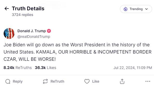“Joe Biden will go down as the Worst President in the history of the United States. KAMALA, OUR HORRIBLE & INCOMPETENT BORDER CZAR, WILL BE WORSE!” he wrote in a separate post.