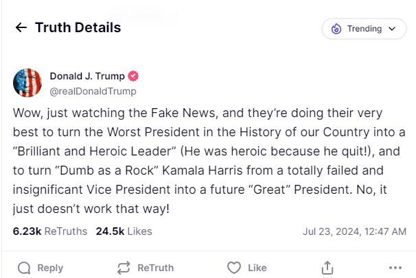 “Wow, just watching the Fake News, and they’re doing their very best to turn the Worst President in the History of our Country into a “Brilliant and Heroic Leader” (He was heroic because he quit!), and to turn “Dumb as a Rock” Kamala Harris from a totally failed and insignificant Vice President into a future “Great” President. No, it just doesn’t work that way!” the former reality television star wrote on TruthSocial.