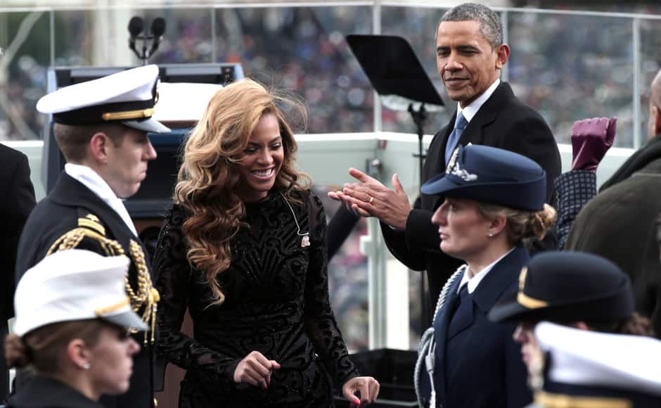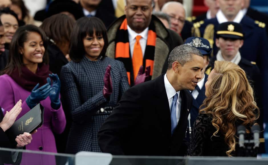 [caption id=“attachment_597419” align=“alignleft” width=“940”]  US President Barack Obama as Beyonce sings the National Anthem at the ceremonial swearing-in at the US Capitol during the 57th Presidential Inauguration in Washington, on Monday. AP[/caption] [caption id=“attachment_597421” align=“alignleft” width=“940”]  President Barack Obama (left) and Vice President Joe Biden (right) listen as Beyonce sings the National Anthem at the ceremonial swearing-in of Obama. AP[/caption] [caption id=“attachment_597445” align=“alignleft” width=“940”]  Beyonce sings the National Anthem at the ceremonial swearing-in for President Barack Obama at the US Capitol during the 57th Presidential Inauguration in Washington, Monday. AP[/caption] [caption id=“attachment_597424” align=“alignleft” width=“940”]  President Barack Obama kisses Beyonce after she sang the National Anthem at the ceremonial swearing-in on the West Front of the US Capitol during the 57th Presidential Inauguration in Washington on Monday. AP[/caption] [caption id=“attachment_597442” align=“alignleft” width=“940”]  A job well done: President Barack Obama applauds singer Beyonce after she sang the National Anthem on the West Front of the Capitol in Washington, Monday during the president’s ceremonial swearing-in ceremony. AP[/caption]