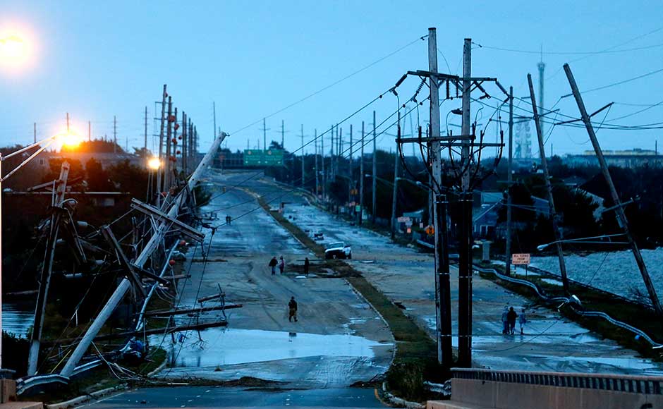 Downed power lines and a battered road is what Hurricane Sandy left behind as people walk off the flooded Seaside Heights island. Sandy, the storm that made landfall Monday, caused multiple fatalities, halted mass transit and cut power to more than 6 million homes and businesses. Julio Cortez/AP