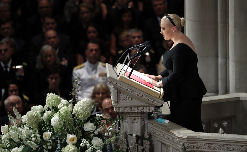 The late senator’s daughter Meghan McCain also delivered an emotional rebuke to Trump without mentioning his name. Taking aim at Trump’s campaign slogan, ‘Make America Great Again,’ she said McCain’s America was always great. AP