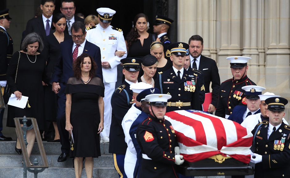 McCain’s body, which had lain in state at the US Capitol, arrived at the cathedral with a motorcade that first stopped at the Vietnam Veterans Memorial. AP