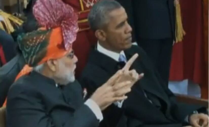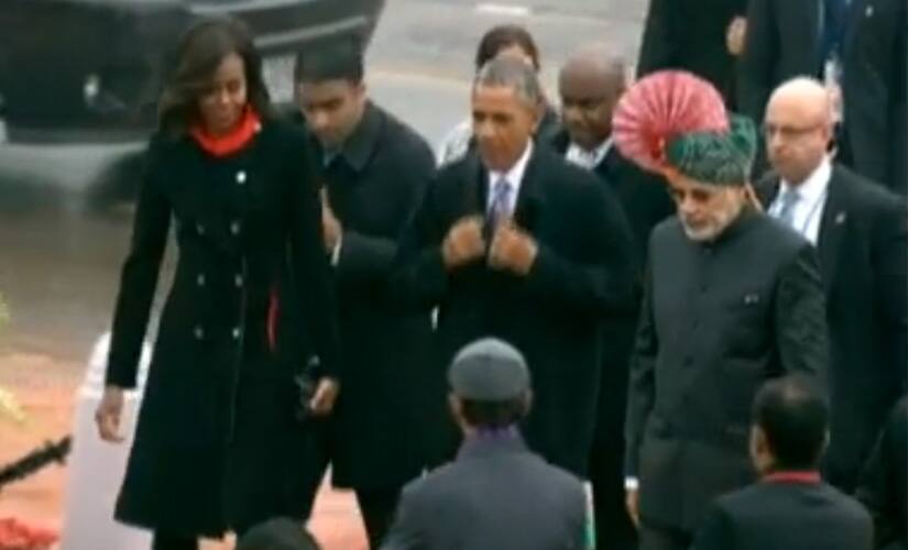 PM Modi seems to be explaining the proceedings to Obama, given that the commentary was conducted entirely in Hindi. Meanwhile the word on the flypast seems to be that it will be conducted as usual. And right on cue, we see choppers flying overhead, kicking off the parade. 9.55 am: Obama gets even bigger cheer than Modi at Rajpath ..though it’s unlikely that Modi will mind. Michelle Obama has also joined him, and the enthusiastic DD anchor just called her an epitome of ’elegance and grace’. Former PM Manmohan Singh was also shown, standing at the VVIP enclosure along with his wife. [caption id=“attachment_2064057” align=“alignnone” width=“825”] ![Obama arrives to huge cheers](https://images.firstpost.com/wp-content/uploads/2015/01/MOdi-Obama-Delhi-2.jpg) Obama arrives to huge cheers[/caption] 9.50 am: PM Modi arrives at Rajpath to huge cheers A huge US contingent is present at Rajpath to view the parade, where PM Modi has just arrived to huge cheers. President Pranab Mukherjee has also arrived, as has defence minister Manohar Parrikar. They are all at the saluting station, where President Obama will also join him. The parade itself will begin in a few moments. 9.30 am: PM Modi to pay respects at Amar Jawan Jyoti Prime Minister Narendra Modi was at the Amar Jawan Jyoti and with the three heads of service paid homage to the soldiers who have fallen while defending India’s borders. Along with him are the Defence Minister and the head of the Army, Navy and Air Force. Two minutes of silence was observed after the wreath is laid at the memorial at India Gate 9.05 pm: Flypast may be cancelled PM Modi, who is probably still smiling at the memory of all those ‘bromantic’ moments with Obama, has sent out a tweet, greeting the nation on Republic Day.