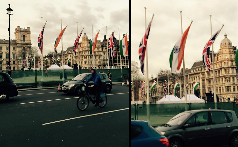 The Indian Flag flying next to the United Kingdom’s Union Jack. Official FB page of India in UK (High Commission of India, London)