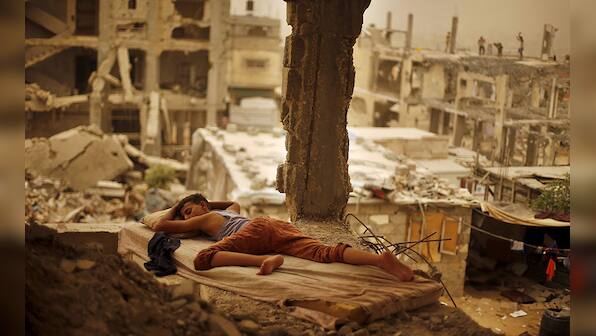 A Palestinian boy sleeps on a mattress inside the remains of his family’s house, that witnesses said was destroyed by Israeli shelling during a 50-day war in 2014 summer, during a sandstorm in Gaza. Reuters/Suhaib Salem