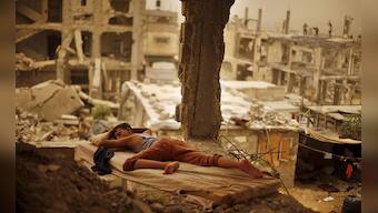 A Palestinian boy sleeps on a mattress inside the remains of his family's house, that witnesses said was destroyed by Israeli shelling during a 50-day war in 2014 summer, during a sandstorm in Gaza. Reuters/Suhaib Salem