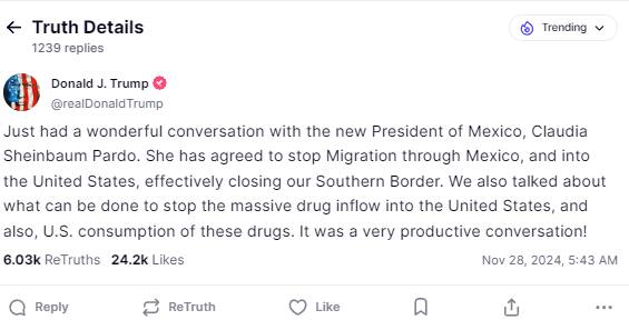 After the call on Wednesday, Trump took to Truth Social, claiming that during the call, Sheinbaum had “agreed to stop Migration through Mexico, and into the United States, effectively closing our Southern Border”. After clarifying it on X, formerly known as Twitter, Sheinbaum reiterated that she did not agree to shut down the Mexican border with the United States.