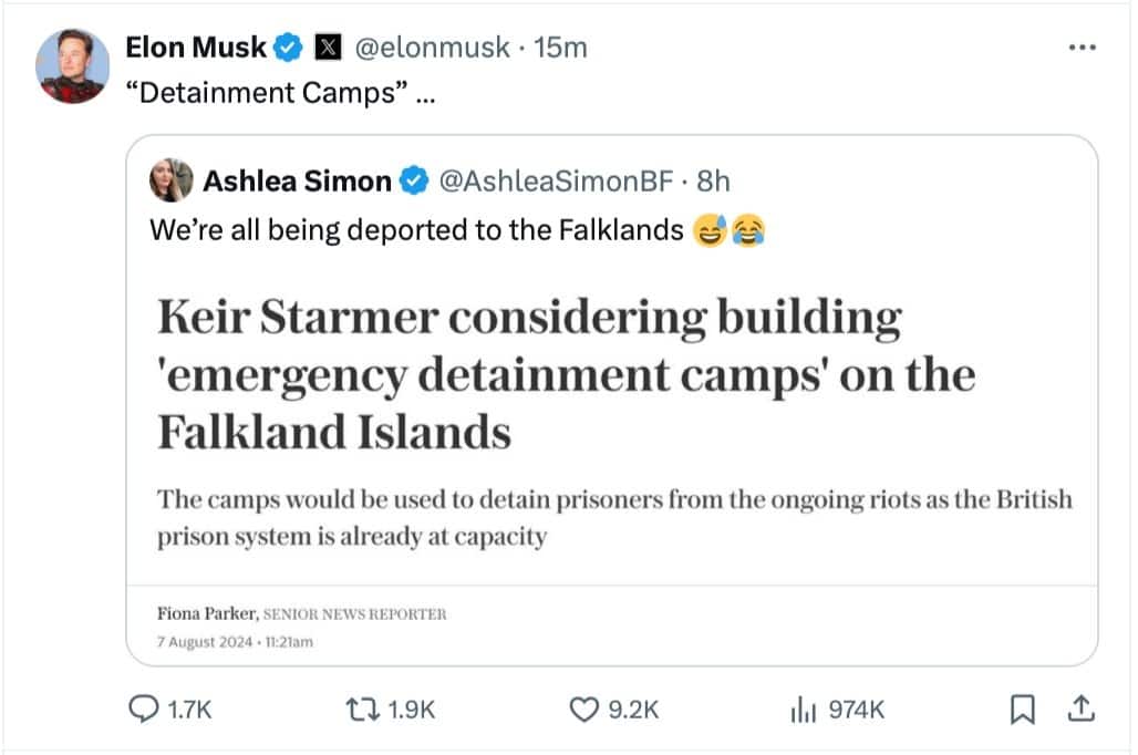 Tesla CEO Elon Musk shared and then deleted fake news that claimed that the UK PM Keir Starmer is considering sending rioters to ‘detainment camps’ in the Falkland Islands