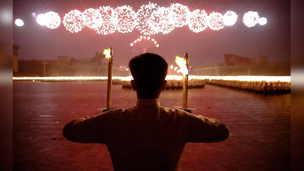 Fireworks explode over participants carrying torches during a torchlight procession in the capital’s main ceremonial square, a day after the ruling Workers’ Party of Korea party wrapped up its first congress in 36 years, in Pyongyang, North Korea. Reuters