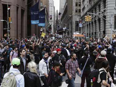 New York: Anti-Wall Street protestors declared victory today after New York authorities at the last minute put off plans to evacuate the park turned tent city that they have been occupying for the last month. But at least three people were arrested close to the square when scuffles broke out with police, an AFP journalist said. Police intervened when a group of demonstrators were walking along the road instead of on the sidewalk, which is prohibited. One of those arrested had a bloodied face. Earlier the owners of the property suspended a request for the city to clear the square for routine cleaning and said they believed they could reach an agreement with the protestors, Deputy Mayor Cas Holloway said in a statement. The demonstrators had vowed a pre-dawn show of strength to prevent their eviction from the makeshift base that is the symbolic epicenter of their fledgling but growing movement which has spread nationwide in recent weeks. But Brookfield Properties, which owns the site, “believes they can work out an arrangement with the protestors that will ensure the park remains clean, safe, available for public use,” Holloway added. [caption id=“attachment_108469” align=“alignleft” width=“380” caption=“Members of the Occupy Wall Street movement march down Wall Street during a protest march through the financial district of New York October 14, 2011. Lucas Jackson/Reuters.”]  [/caption] Thousands of protestors, many of whom stayed up all night girding for a showdown with police, hailed the decision as a victory for their demonstrations against alleged corporate greed and corruption. “People united will never be defeated!” they chanted after word of the decision spread through the camp in Zuccotti Park, located in the heart of the financial district, which the protestors have renamed “Liberty Plaza.” “It is a big victory for us,” said Senia Barragan, a spokeswoman for the demonstrators, adding the movement had been helped by the large numbers who came out to support them. New York Mayor Michael Bloomberg had visited the area late Wednesday to reassure the protesters that demonstrations could continue after the clean-up. But New York police chief Ray Kelly had hinted at a showdown when he indicated the protestors would no longer be allowed to carry on camping out. “I was ready to be arrested, but I’m going to go to work,” said Zach Loeb, a 27-year-old part-time librarian, who has helped set up a library in the park. “I feel thrilled, energised, but my guard is not down,” he added. A small band of protestors began camping out in Zuccotti Park on September 17, preaching an anti-capitalist message that has resonated in an America gripped by high unemployment and struggling to emerge from a painful recession. Sister protest groups have sprung up in other major US cities, and former American vice president turned climate-change activist Al Gore on Thursday became the latest high-profile name to throw his support behind the movement. Up to 600 protesters have been camping out overnight in sleeping bags and tents in the New York park, and the occupation shows signs of permanence: food stalls have sprung up, an infirmary, an information desk, as well as the library. But protestors have no toilet facilities of their own and depend on local restaurants. As their numbers have grown so have the reports of locals complaining about people urinating in the streets. The demonstrators, who deny there are any health issues and say they tidy the square daily, had conducted a thorough clean-up on Thursday to try to forestall intervention by the authorities. Some of their belongings had been removed and flowers replanted in the beds. The nationwide activist movement has already had several run-ins with the authorities. At the end of last month more than 700 protestors were arrested for blocking weekend traffic on the Brooklyn Bridge in New York. In Boston some 700 police launched the biggest crackdown so far on the movement in the early hours of Tuesday morning, descending on parks to arrest more than 100 protestors for unlawful assembly. A poll by Time magazine showed 54 percent of Americans had a somewhat favourable or very favourable view of the protestors, while 23 percent disapproved and the remaining 24 percent of those surveyed were undecided. AFP