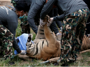 Bangkok: Thai wildlife authorities found 40 tiger cub carcasses in a freezer in Thailand’s infamous Tiger Temple on Wednesday as they removed live animals in response to international pressure over suspected trafficking and abuse. [caption id=“attachment_2812954” align=“alignleft” width=“380”] Besides the skins, members from the National Parks Conservation Department investigating the temple since Monday, also found hundreds of amulets allegedly containing tiger remains such as bones and teeth. Reuters[/caption] Thai authorities recovered two tiger skins on Thursday from inside a truck as it tried to leave a controversial temple, which used the big cats to attract tourists. Besides the skins, members from the National Parks Conservation Department investigating the temple since Monday, also found hundreds of amulets allegedly containing tiger remains such as bones and teeth. The Buddhist temple in Kanchanaburi province west of Bangkok had become a tourist destination where visitors snapped selfies with bottle-fed cubs. But the temple has been investigated for suspected links to wildlife trafficking and abuse. A raid that began on Monday is the latest move in a tug-of-war since 2001 to bring the tigers under state control. Tiger parts are used in traditional Chinese medicine. The 40 dead tiger cubs were found in a freezer in a kitchen area, said Adisorn Nuchdamrong, deputy director-general of the Department of National Parks. “Foreign volunteers at the temple today told us about it and showed us the freezer. Perhaps they felt what the temple is doing isn’t right,” Adisorn said. “They must be of some value for the temple to keep them,” he said. “But for what is beyond me.” Officials wearing protective masks displayed the bodies of the cubs to media at the temple. Also on display was the body of a Binturong, a protected species commonly known as a bearcat, which the authorities found with the cub carcasses. The temple said in a comment on its Facebook page that wildlife authorities had already been aware that the carcasses were in the freezer. The carcasses of cubs that had died had been kept, rather than cremated, since 2010 on the instructions of a former vet, it said. Adisorn told Reuters the department had not previously known about the cubs. “The temple has notified us when grown tigers die, but never the cubs,” he said. Officials have moved 61 live tigers from the temple since Monday, Adisorn said, leaving 76 still there. Thailand has long been a hub for the illicit trafficking of wildlife and forest products, including ivory. Exotic birds, mammals and reptiles, some of them endangered species, can often be found on sale in markets. “It’s clear that the welfare of the tigers is not a priority and their lives are full of abuse and commercial exploitation for the entertainment of tourists,” said Jan Schmidt, Asia-Pacific Wildlife Adviser at World Animal Protection, in a statement.