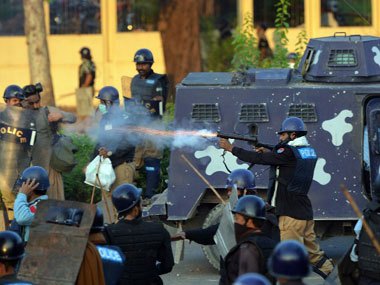 Islamabad: More than 400 people were injured as Pakistani police battled throngs of protesters demanding the resignation of Prime Minister Nawaz Sharif with tear gas, batons and rubber bullets outside the prime minister’s official residence and the adjacent parliament building. [caption id=“attachment_1689601” align=“alignleft” width=“380”]  Pakistani policemen fire tear gas shell at protesters near Nawaz Sharif’s residence in Islamabad on Saturday. AFP[/caption] Tehreek-ek-Insaf chief Imran Khan responded saying the Sharif government was terrorising the people of the country. Police action against the agitators should be condemned, he said, promising to file a First Information Report with the police against Sharif. The clashes started after orders by Imran Khan and cleric Tahir-ul-Qadri on Saturday to shift their protest venue to the official residence of Sharif to force him resign immediately. At least 400 injured were brought to the Polyclinic and Pakistan Institute of Medical Sciences, the two premier state-run hospitals, a Pakistani channel Duniya TV reported. One woman was killed in police firing. Close to midnight, turmoil prevailed in the heart of Islamabad after a number of demonstrators refused to disperse from the protest site. Hundreds of protesters entered the lawn of parliament but they were stopped at the main entrance of the building where army soldiers were deployed. Khan and Qadri are with the protesters and exhorting their supporters to force their way towards the PM’s residence. Information Minister Pervaiz Rashid said that protesters had committed a crime by attacking parliament which is a “symbol of democracy”. The clashes were continuing as police pushed them back with intense shelling of tear gas and rubber bullets. The situation was tense in the capital as a number of demonstrators refused to budge from the protest site. Both the leaders are agitating since August 14 against alleged rigging during last year general elections. “I will lead the march to the PM House. All my supporters should follow me,” Khan said asking women and children to stay behind until asked by him to join the march towards the PM House. Khan’s announcement came soon after a similar decision by Qadri. Thousands of police and paramilitary personnel were deployed blocking all the roads leading to the PM residence. Khan asked his supporters to remain peaceful and asked law enforcement agencies not to stop the agitators. As tension mounted, Sharif left for Lahore. A late night government announcement categorically ruled out Sharif’s resignation and there is no threat to his life. On Saturday, the protesters used crane and bolt cutters to inch their way past a barricade of shipping containers as authorities rushed forces to deal with the volatile situation. Before the protesters set off on their march, the interior ministry announced that soldiers would be deployed to stop the protesters. Agencies