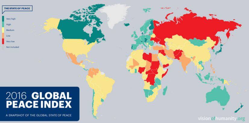 In the 2016 Global Peace Index (GPI) curated by The Institute of Economics and Peace (IEP) think tank, India ranks at an abysmal 141 out of the 164 countries, trailing Mexico. The index gauges the level of safety and security in society, the extent of domestic or international conflict and the degree of militarisation. The report says, “India’s scores for ongoing domestic and international conflict and militarisation have deteriorated slightly,” and that the country “remains vulnerable to acts of terror and security threats at its shared border with Pakistan.” According to the GPI report, the world has overall become a less peaceful place. It’s not all that surprising and seems to be reinforcing a 10-year-trend — terrorism and political instability are two of the main causes of the deterioration. The report highlights that terrorism is at an all time high and trends show that it has been growing steadily over the past decade. Major terrorist activity has been concentrated around Iraq, Nigeria, Afghanistan, Pakistan and Syria. Terrorism is only spreading — there are only 23 percent of countries that have not experienced a terrorist incident since WWII. Terrorist attacks in Paris and Brussels, increase in incidents of violence in Turkey and its neighbours are why Europe, though still one of the most peaceful regions, has shown a decline in overall peace. [caption id=“attachment_2826780” align=“alignnone” width=“825”]  Source: IEP[/caption] According the GPI report, this decline in world peace is rather historic and in fact interrupts the improvements and strides in securing peace since the end of World War II. Middle and North East African (Mena) regions have seen intense conflict in the last ten years. And in the last 60 years, the number of refugees and displaced people are at a record level. In a press statement, Steve Killelea, the founder of IEP said, “As internal conflicts in MENA become more entrenched, external parties are increasingly becoming more involved and the potential for indirect or ‘war by proxy’ between nation states is rising. This was already evident in Syria with the conflict between the Assad regime and multiple non-state actors, and is now spilling into countries such as Yemen. There is a broader proxy conflict between Saudi Arabia and Iran, and more recently both US and Russia have increased their level of involvement.” [caption id=“attachment_2826794” align=“alignnone” width=“825”]  Source: IEP[/caption] The South Asian region as a whole has not changed from it’s position. The report suggests that internal security concerns heightened in Bangladesh and Nepal — detainees have increased owing to protests against the government. Madhesis, who are largely of Indian-origin, led a nearly six-month-long violent protest over better representation in the Nepal Parliament and the federal structure of the new Constitution that divides their ancestral homeland. The protests claimed over 50 lives before being called off unexpectedly. And another factor that could explain the deterioration in Bangladesh is the recent and frequent killing of people in the region by Islamist militants. Pakistan remains in a bad position on the index, owing primarily to the influence of Taliban from Afghanistan. Sri Lanka is the only country that did really well on the index from the South-Asian region, ranking at 115 (jumping ahead by 31 ranks from 2008), the report alludes this increased peacefulness to Sri Lanka bettering its relationships with its neighbours, especially India. The silver lining of this dark conflict ridden cloud is that there have been great strides made by the international community as a whole to provide funding and support to peacekeeping operations and the commitment to UN peacekeeping funding has increased by 12 percent. This signals the rise of an international community that values peace and is keen on building ties, maintaining peace and security.