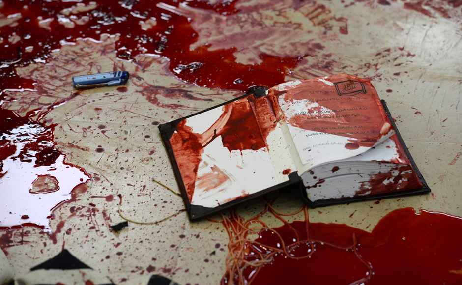Pools of blood are seen near a religious Jewish text at the scene of an attack at a Jerusalem synagogue. The attack, deadliest since 2008, has shaken up the Holy City. Reuters