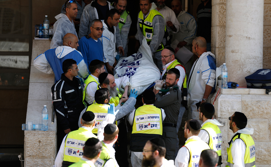 Israeli emergency personnel carry the body of a victim from the scene of an attack at the Jerusalem synagogue. Two suspected Palestinian men armed with meat cleavers and a gun killed four people on Tuesday. Reuters