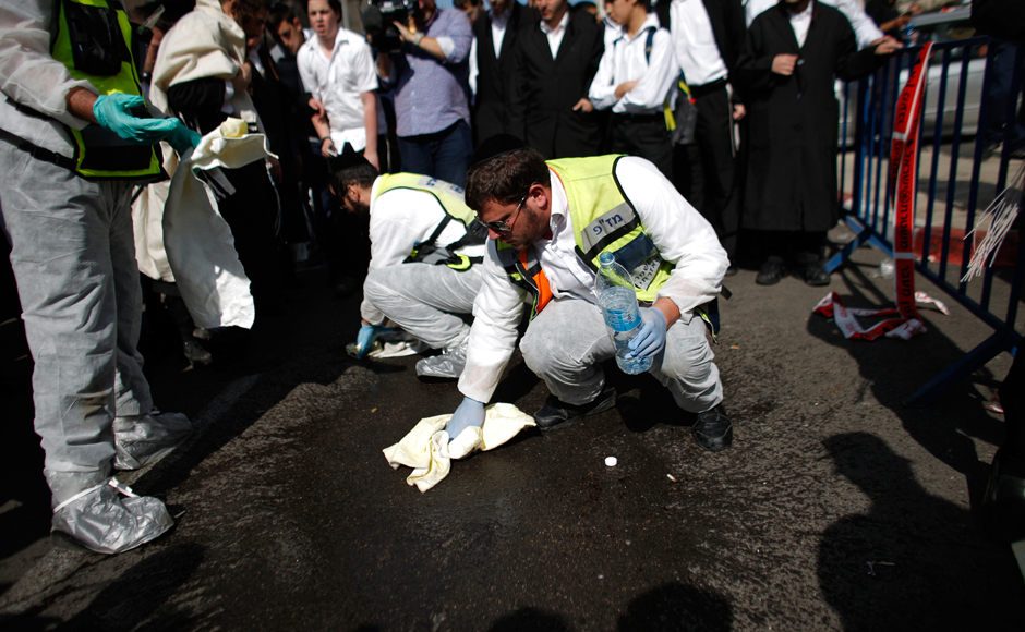 Members of the Israeli Zaka emergency response team clean blood at the scene of an attack. Both Palestinians were shot dead by police, the deadliest such incident in six years. Reuters