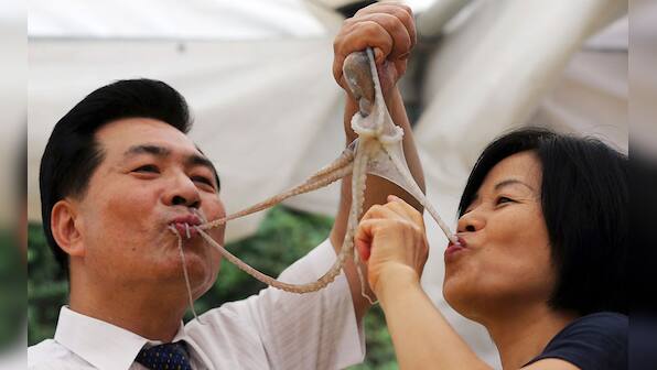 [caption id=“attachment_1103909” align=“alignleft” width=“940”]  South Koreans eat a live octopus during local food festival in Seoul, South Korea, Thursday, Sept. 12, 2013. Live octopus is delicacy in the country. AP Photo/Yonhap, Shin Jun-hee[/caption] [caption id=“attachment_1103911” align=“alignleft” width=“940”]  (L)A South Korean woman holdsup a live octopus during an event to promote a local food festival. (R) A South Korean man in the process of eating a live octopus. AFP PHOTO / JUNG YEON-JE[/caption] [caption id=“attachment_1103919” align=“alignleft” width=“940”]  Live octopus are seen in a water tank during an event to promote a local food festival in Seoul on September 12, 2013: AFP[/caption] [caption id=“attachment_1103921” align=“alignleft” width=“940”]  A South Korean man chews on a live octopus during an event to promote a local food festival in Seoul on September 12, 2013. AFP PHOTO / JUNG YEON-JE[/caption]
