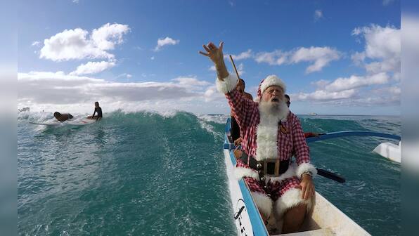 HEIGH HO: Santa Claus, waves to surfers as he canoe surfs off Waikiki beach in Honolulu, Hawaii. Reuters