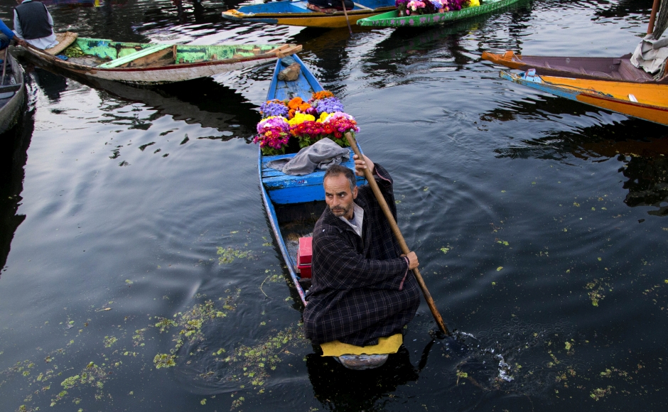 7 October: A Kashmiri flower vendor rows his boat at the floating vegetable market on Dal lake in Srinagar, Kashmir. Vegetables traded in this floating market are supplied to Srinagar and many towns across the Kashmir valley. It’s one of the major sources of income for the lake dwellers who spend years carefully nurturing their floating gardens from the weed and rich soil extracted from the lake bed. Sometimes a boat will weave through, selling flowers to the tourists who stay in the houseboats. AP/Dar Yasin