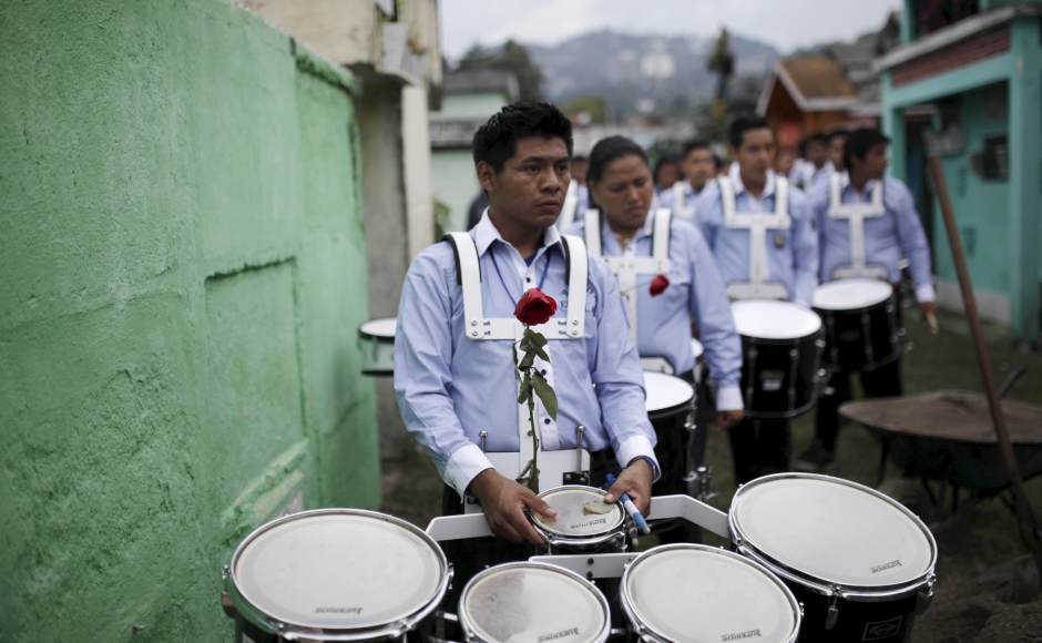 5 October: Bandmates participate in the funeral of Bryan Sandoval, a mudslide victim in Santa Catarina Pinula, on the outskirts of Guatemala City. Seven members of the Sandoval family were buried together after their bodies were found. Despair in the search for hundreds of people buried in a landslide that swallowed part of a Guatemalan town is so deep that some relatives feel lucky simply to have found the bodies of their loved ones. Families on Sunday lit candles for relatives engulfed by a mass of earth and rubble that crashed down on a neighborhood in Santa Catarina Pinula. Rescue teams have found more than 120 bodies and up to 300 others are missing and feared dead. Reuters/Jose Cabezas