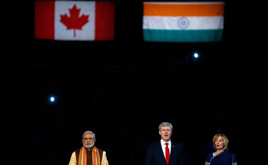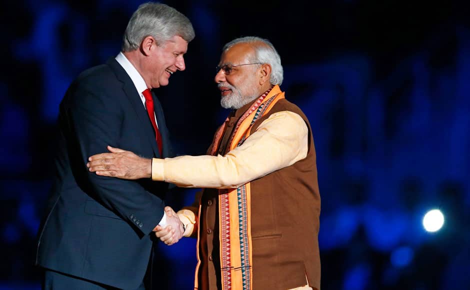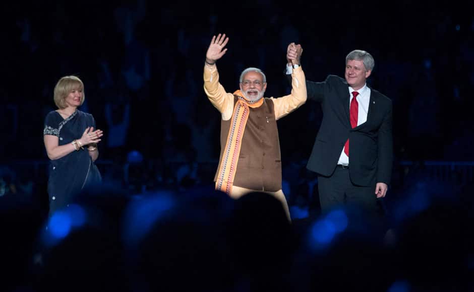 [caption id=“attachment_2198562” align=“alignleft” width=“940”]  Just as the organizers had advertised, Prime Minister Narendra Modi’s public interaction with the Indian diaspora at Ricoh Coliseum here on Wednesday had all the trappings of a rockstar concert as Bollywood singer Sukhwinder Singh, Shiamak Davar troupe and other groups set the tone for the evening. (Image courtesy: AP)[/caption] [caption id=“attachment_2198568” align=“alignleft” width=“940”]  Prime Minister Narendra Modi with Canadian Prime Minister Stephen Harper and his wife Laureen Harper at the end of the event at Ricoh Coliseum in Toronto on Wednesday. (Image courtesy: AP)[/caption] [caption id=“attachment_2198570” align=“alignleft” width=“940”]  The nearly 10,000-strong audience interrupted Modi repeatedly during his hour-long speech with shouts of “Modi, Modi…” as the PM spoke about the changes sweeping India. (Image courtesy: AP)[/caption] [caption id=“attachment_2198572” align=“alignleft” width=“940”]  Performances by classical dancers were organised to entertain the audience in Toronto on Wednesday. (Image courtesy: Reuters)[/caption] [caption id=“attachment_2198576” align=“alignleft” width=“940”]  Prime Minister Narendra Modi with Canadian Prime Minister Stephen Harper and his wife Laureen Harper as they sing the Canadian national anthem ahead of a speech to the public in Toronto on Wednesday. (Image courtesy: Reuters)[/caption] [caption id=“attachment_2198578” align=“alignleft” width=“940”]  Narendra Modi drew the biggest applause from the public when he said his mission is “Skill India” while the previous regime was “Scam India”. (Image courtesy: Reuters)[/caption]