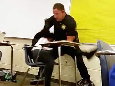 Columbia, South Carolina: A girl who refused to surrender her phone after texting in math class was flipped backward and tossed across the classroom floor by a sheriff’s deputy, prompting a federal civil rights probe in the United States on Tuesday. The sheriff said the girl “may have had a rug burn” but was not injured, and said the teacher and vice-principal felt the officer acted appropriately. Still, videos of the confrontation between a white officer and black teenager stirred such outrage that he called the FBI and Justice Department for help. Sheriff Leon Lott suspended Senior Deputy Ben Fields without pay, and said what he did at Spring Valley High School in Columbia, South Carolina “made him want to throw up.” [caption id=“attachment_2485750” align=“alignleft” width=“380”]  Image courtesy: AP[/caption] Videos taken by students and posted online show Fields warning the girl to leave her seat or be forcibly removed on Monday. The officer then wraps a forearm around her neck, flips her and the desk backward onto the floor, tosses her toward the front of the classroom and handcuffs her. Lott pointed out at a news conference that the girl can also be seen trying to strike the officer as she was being taken down, but said he’s focused on the deputy’s actions as he decides within 24 hours whether Fields should remain on the force. “I think sometimes our officers are put in uncomfortable positions when a teacher can’t control a student,” the sheriff said, promising to be fair. The deputy also arrested a second teenager who verbally objected to his actions. Both girls were charged with disturbing schools and released to their parents. Their names were not officially released. The second student, Niya Kenny, told WLTX-TV that she felt she had to say something. Doris Kenny said she’s proud her daughter was “brave enough to speak out against what was going on.” Appearing on MSNBC Tuesday night, Niya Kenny said an administrator told her to sit down, be quiet and to put her cellphone away. She refused. “‘This is not right,’” Kenny recalled saying in the classroom. “‘I can’t believe y’all are doing this to her.’” Kenny said Fields arrested her and handcuffed her inside the classroom. Districts across the country put officers in schools after teenagers massacred fellow students at Columbine High School in Colorado in 1999. Schools now routinely summon police to discipline students, experts say. At a school board meeting Tuesday night, parents spoke out about the arrest. “This is not a race issue,” said Rebekah Woodford, a white mother of two Spring Valley graduates and one current student. “This is, I want to be defiant and not do what I’m told. … The child is the one who can choose what to do.” School Superintendent Debbie Hamm said “the district will not tolerate any actions that jeopardize the safety of our students.” School Board Chairman Jim Manning called the deputy’s actions “shamefully shocking.” Fields, who also coaches football at the high school, has prevailed against accusations of excessive force and racial bias before. Trial is set for January in the case of an expelled student who claims Fields targeted blacks and falsely accused him of being a gang member in 2013. In another case, a federal jury sided with Fields after a black couple accused him of excessive force and battery during a noise complaint arrest in 2005. A third lawsuit, dismissed in 2009, involved a woman who accused him of battery and violating her rights during a 2006 arrest. AP