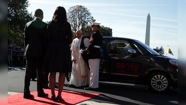 Pope Francis exits his car to greet the U.S. President Barack Obama and first Lady Michelle Obama in an arrival ceremony at the White House on 23 September, 2015 in Washington, DC. The Pope begins his first trip to the United States at the White House followed by a visit to St. Matthew’s Cathedral, and will then hold a Mass on the grounds of the Basilica of the National Shrine of the Immaculate Conception. Getty Images
