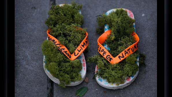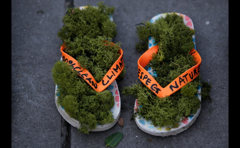 A pair of beach sandals with green moss are symbolically placed on the Place de la Republique, after the cancellation of a planned climate march following shootings in the French capital, ahead of the World Climate Change Conference 2015 (COP21), in Paris, France. Reuters/Eric Gaillard