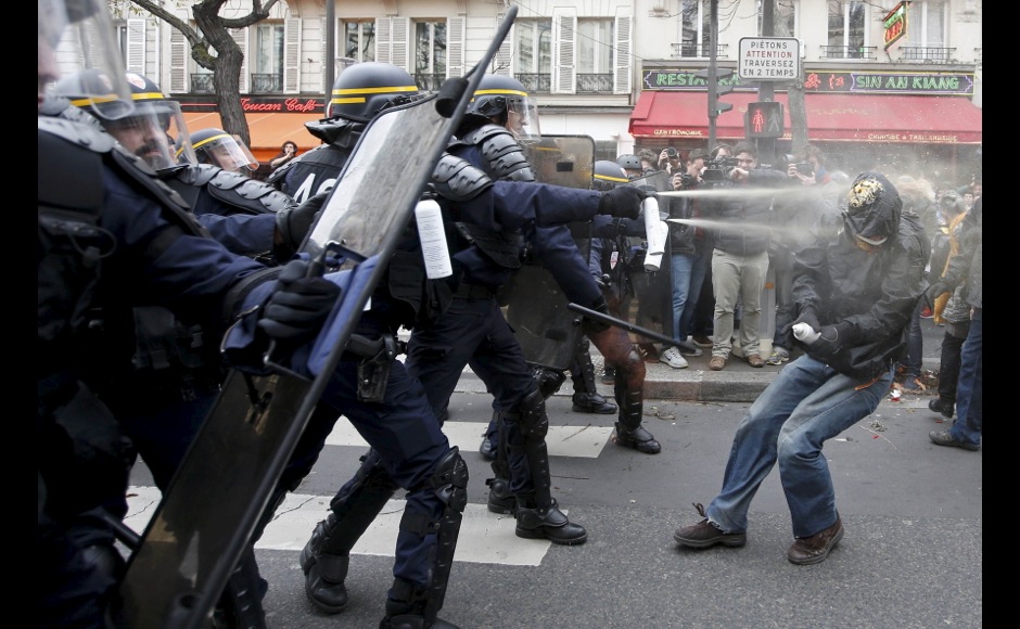 Demonstrators clash with CRS riot policemen near the Place de la Republique after the cancellation of a planned climate march following shootings in the French capital, ahead of the World Climate Change Conference 2015 (COP21), in Paris, France. Reuters/Eric Gaillard