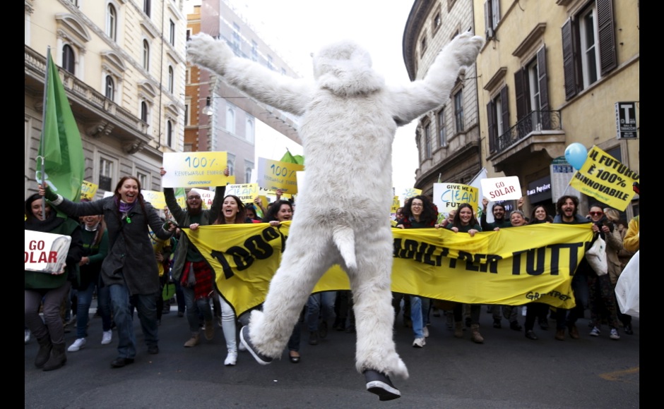 A Greenpeace activist dressed as a bear holds up a banner during a rally held before the start of the Paris COP21, in Mexico City, Mexico. The banner reads, “Climate Change”. Reuters/Daniel Becerril