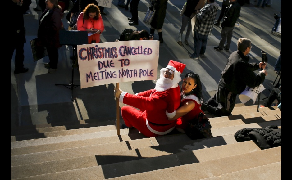 Protesters dressed as Santa Claus take part in a protest about climate change at New York City Hall steps in lower Manhattan. Reuters/Eduardo Munoz