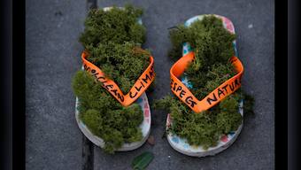 A pair of beach sandals with green moss are symbolically placed on the Place de la Republique, after the cancellation of a planned climate march following shootings in the French capital, ahead of the World Climate Change Conference 2015 (COP21), in Paris, France. Reuters/Eric Gaillard