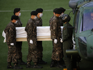 File photo of the South Korean military soldiers carrying the coffin of a passenger who was onboard the sunken passenger ship Sewol, into a military helicopter in the port city of Jindo. Reuters[/caption] Searchers have found 276 bodies, and 28 passengers remain missing. Most of the victims were students from a single high school south of Seoul. Improved weather allowed the search to resume early Tuesday, government task force spokesman Ko Myung-seok said. Nearly a month after the ferry sank, the search teams have been hampered by bad weather, floating debris inside the ship and, lately, the vessel’s deterioration. According to Ko, it has been difficult to enter some of the rooms because waterlogged walls have partially collapsed and blocked passages. Only 172 people, including 22 of the 29 crew members, survived the 16 April disaster. All 15 surviving crew members involved in the ferry’s navigation have been arrested on suspicion of negligence and failing to protect passengers. An investigation team probing the ferry’s sinking formally arrested an employee of a private safety device inspection company on Monday. Prosecutor Yang Jung-jin said the employee is suspected of carrying out poor inspections on the ferry’s safety equipment. AP