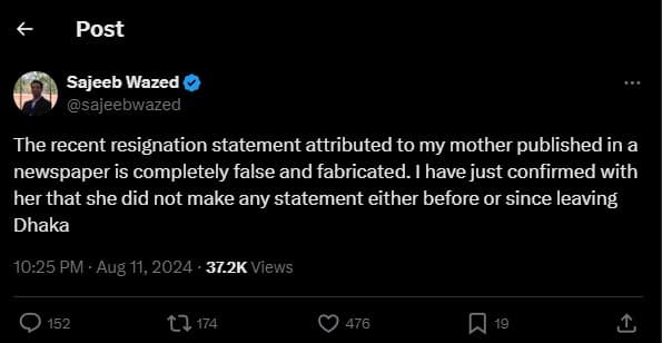 “The recent resignation statement attributed to my mother published in a newspaper is completely false and fabricated,” Wazed wrote on X, on Sunday evening. “I have just confirmed with her that she did not make any statement either before or since leaving Dhaka,” he furthered.